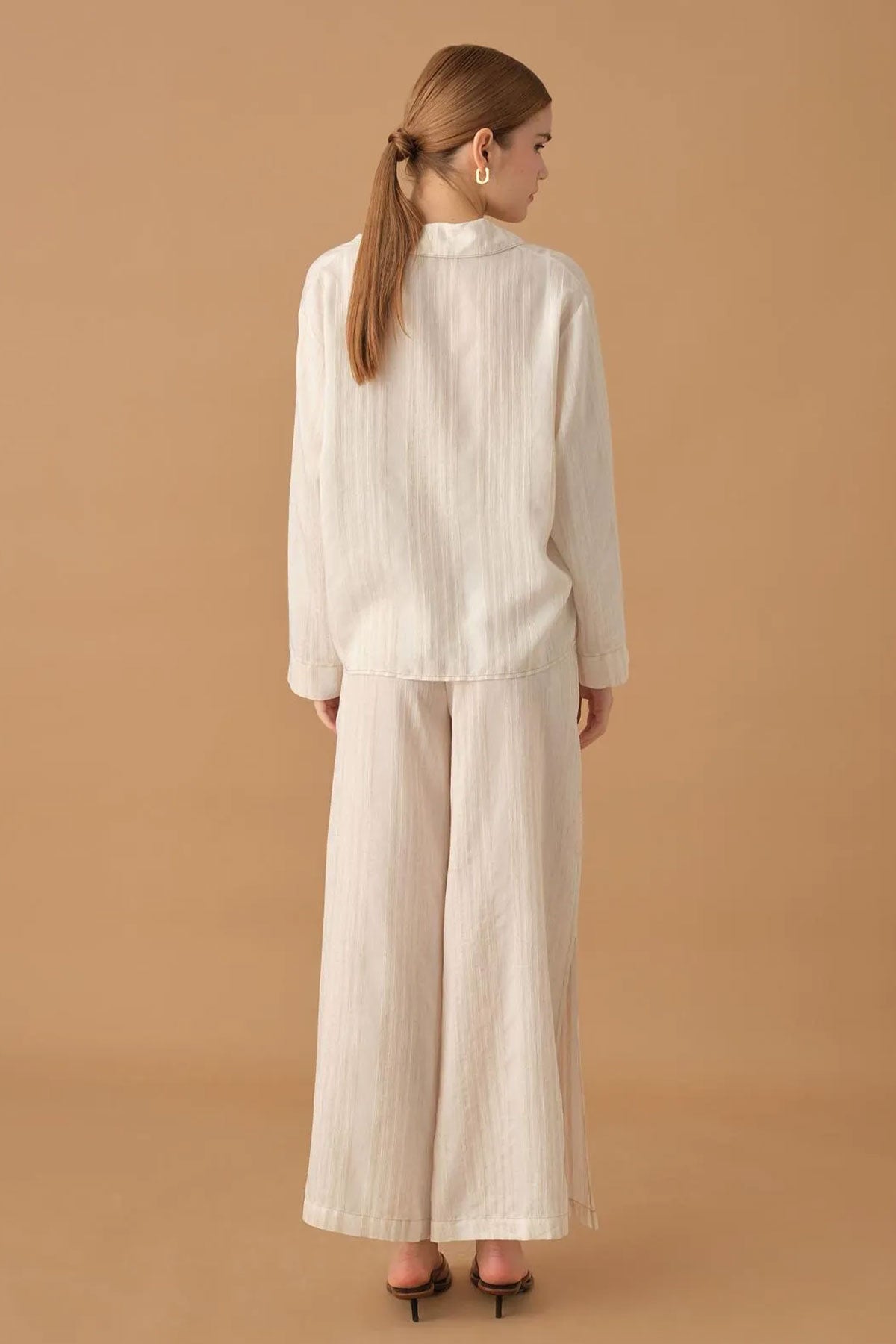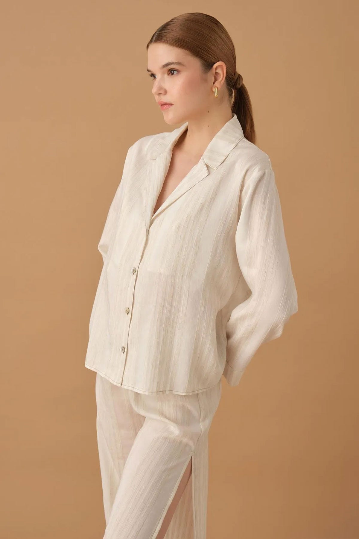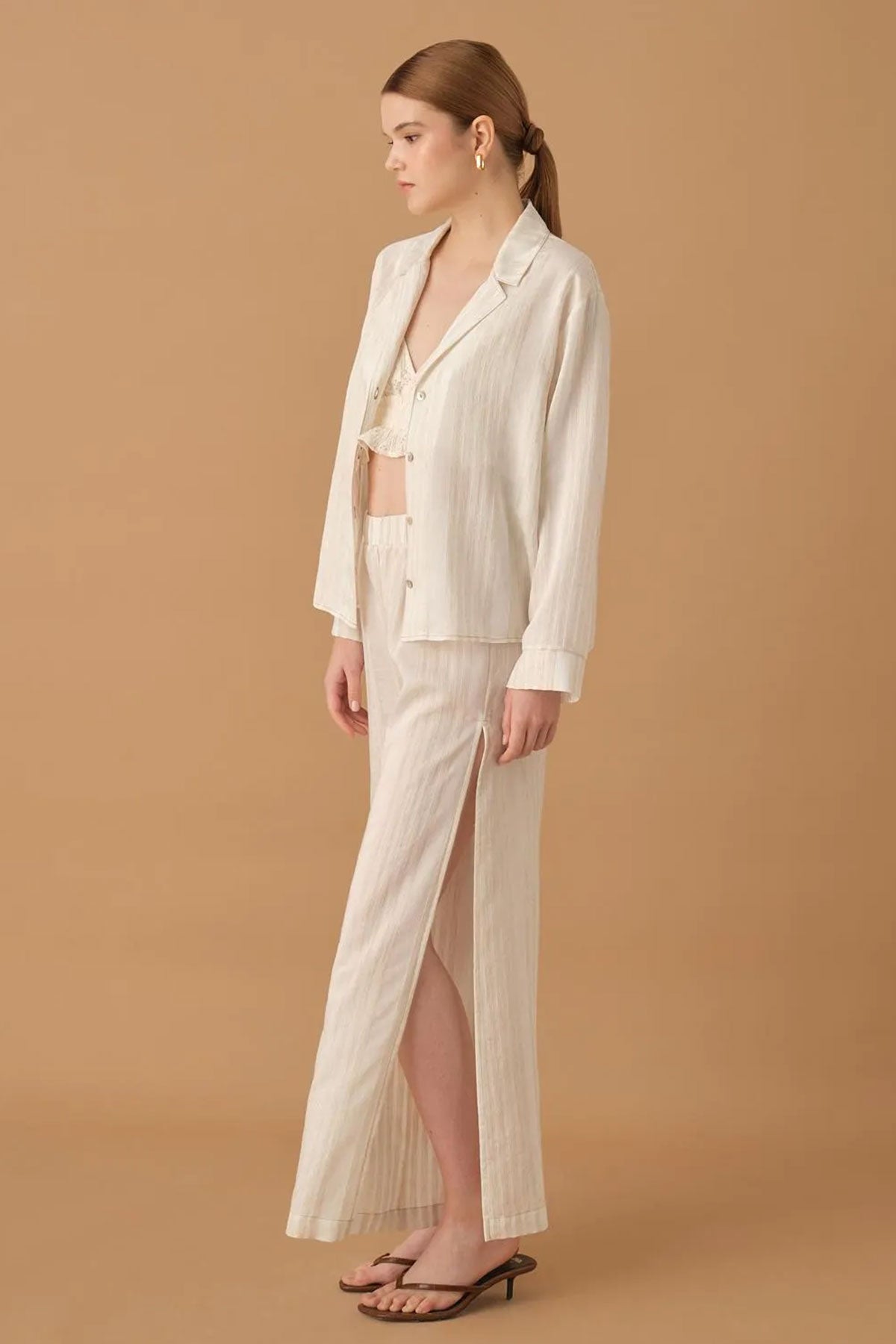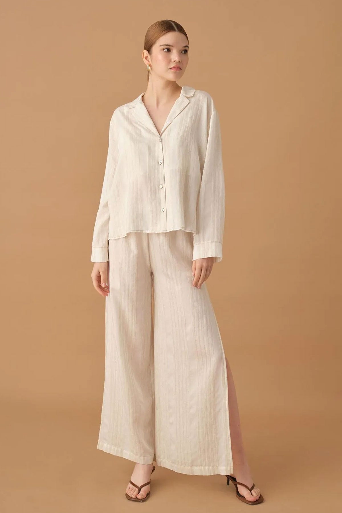 Pierre Cardin Kadın Gömlek Yaka 3'lü Pijama Takımı Keten Büstiyerli Altı Yırtmaçlı