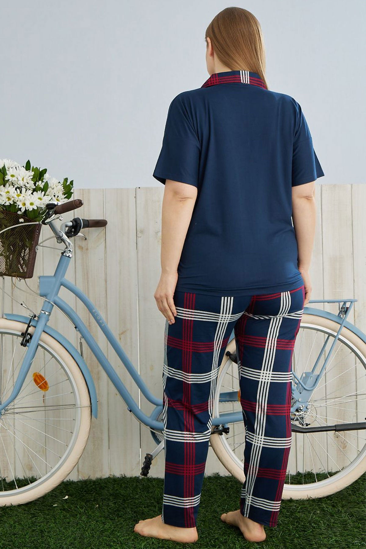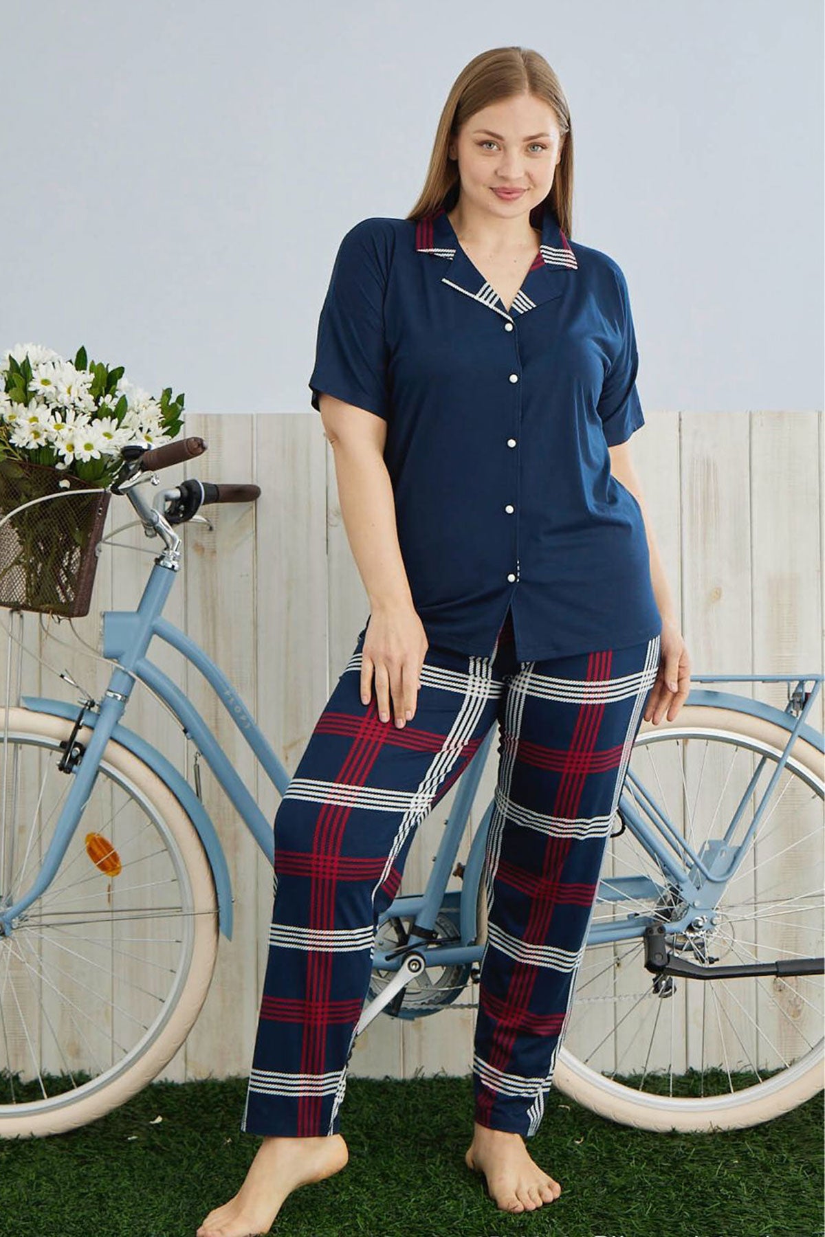 Pijamoni Kadın Büyük Beden Gömlek Yaka Pijama Takımı Kısa Kollu Milan Kumaş