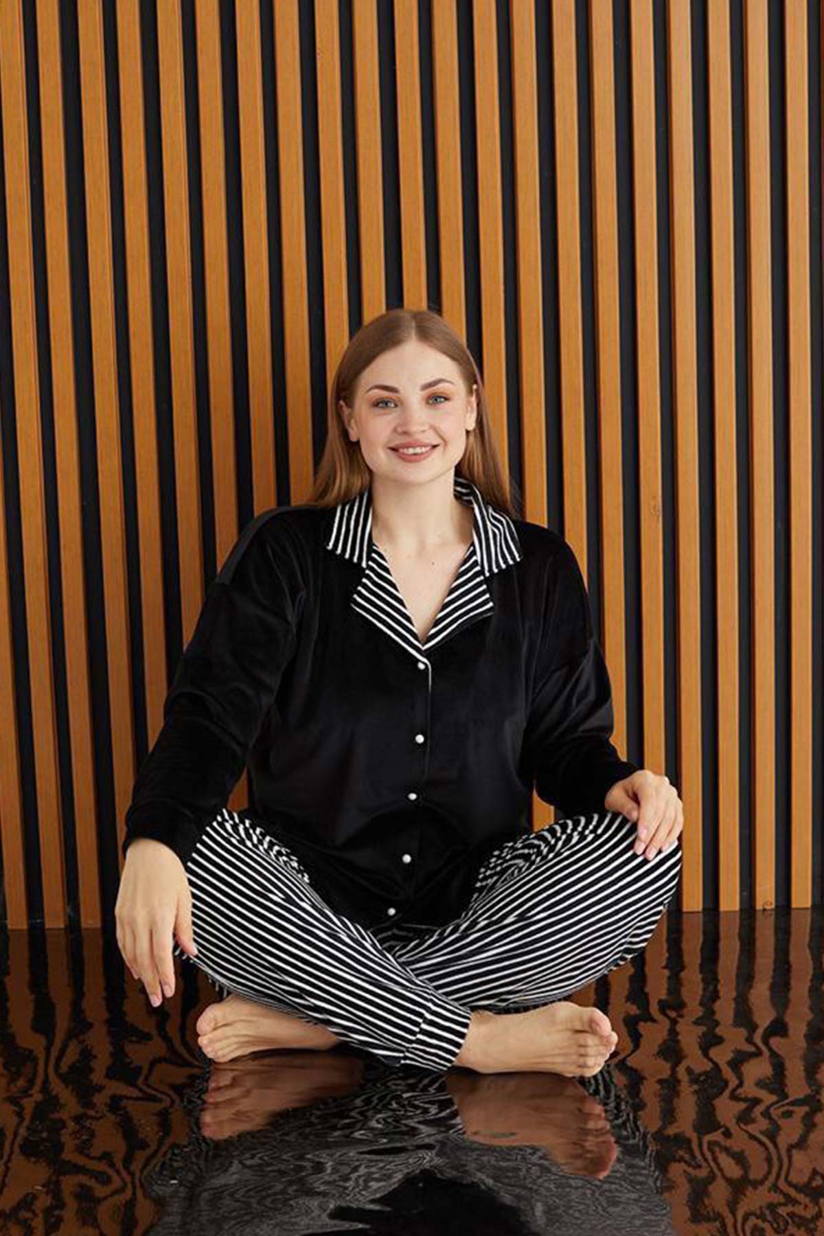Pijamoni Kadın Pijama Takımı Uzun Kollu Gömlek Yaka Büyük Beden Kadife Manşetli Paça Çizgili