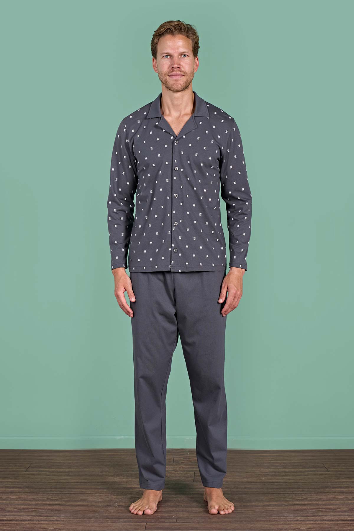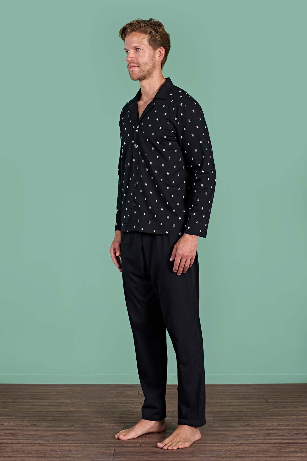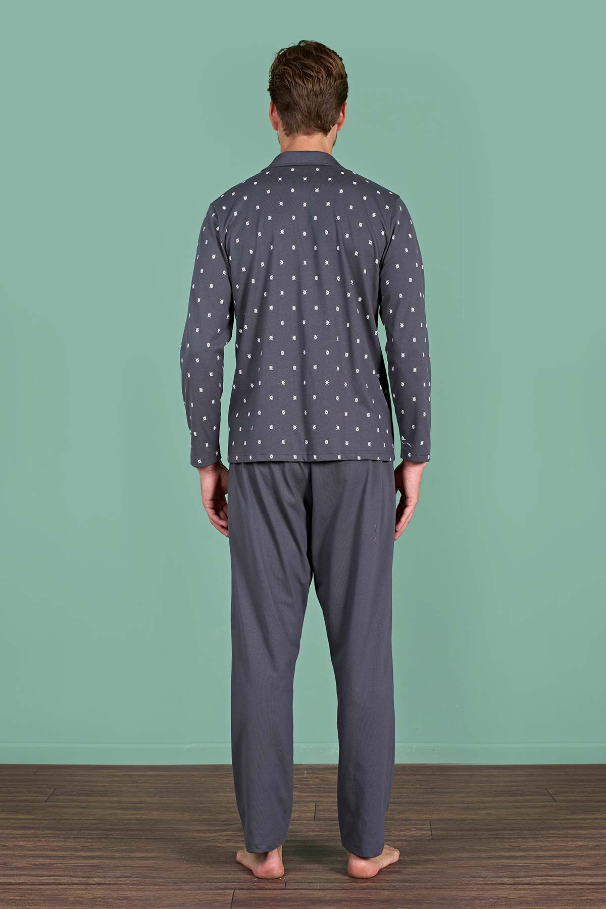 Pınarca Erkek Pijama Takımı Uzun Kollu Gömlek Yaka Büyük Beden Desenli Pamuklu