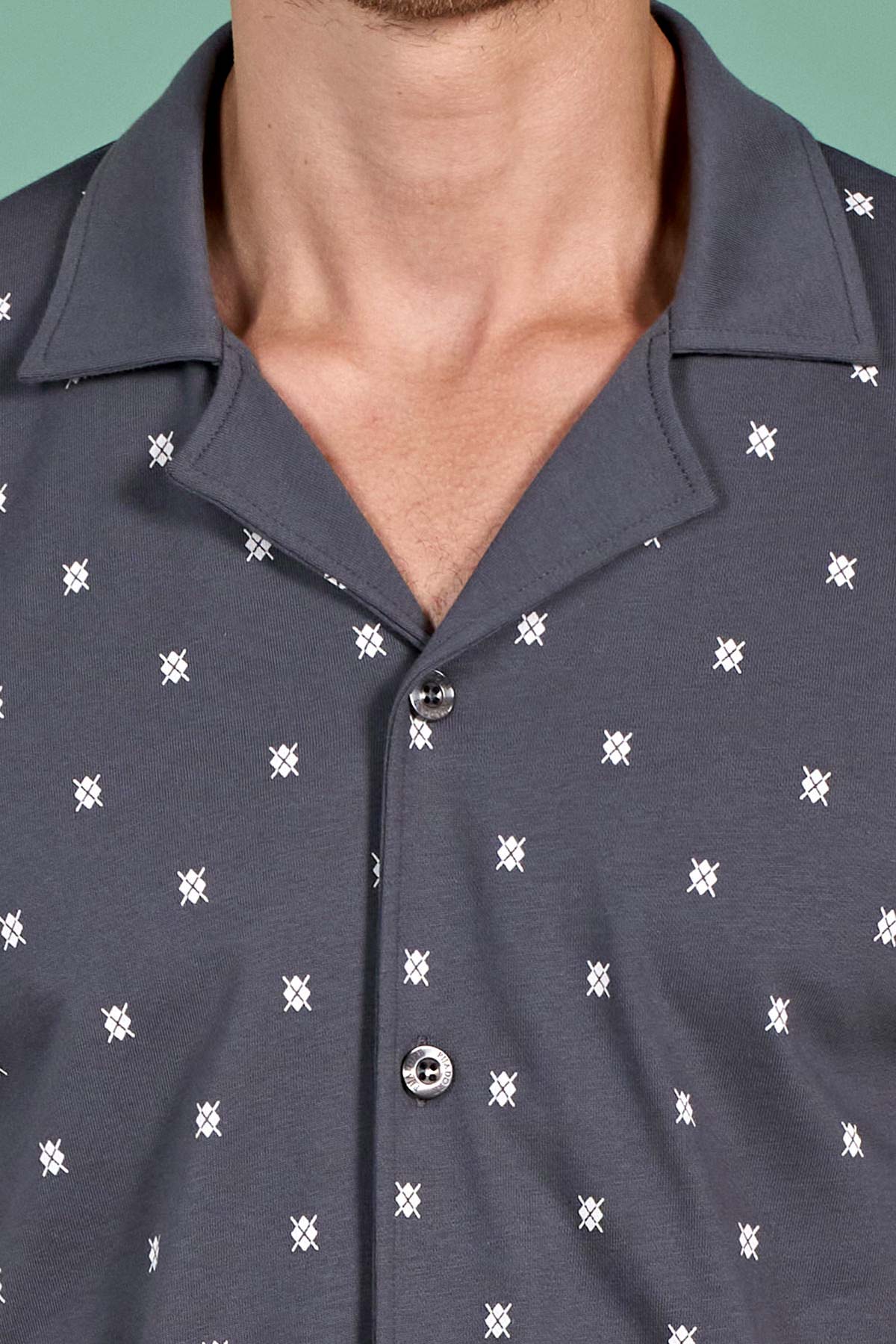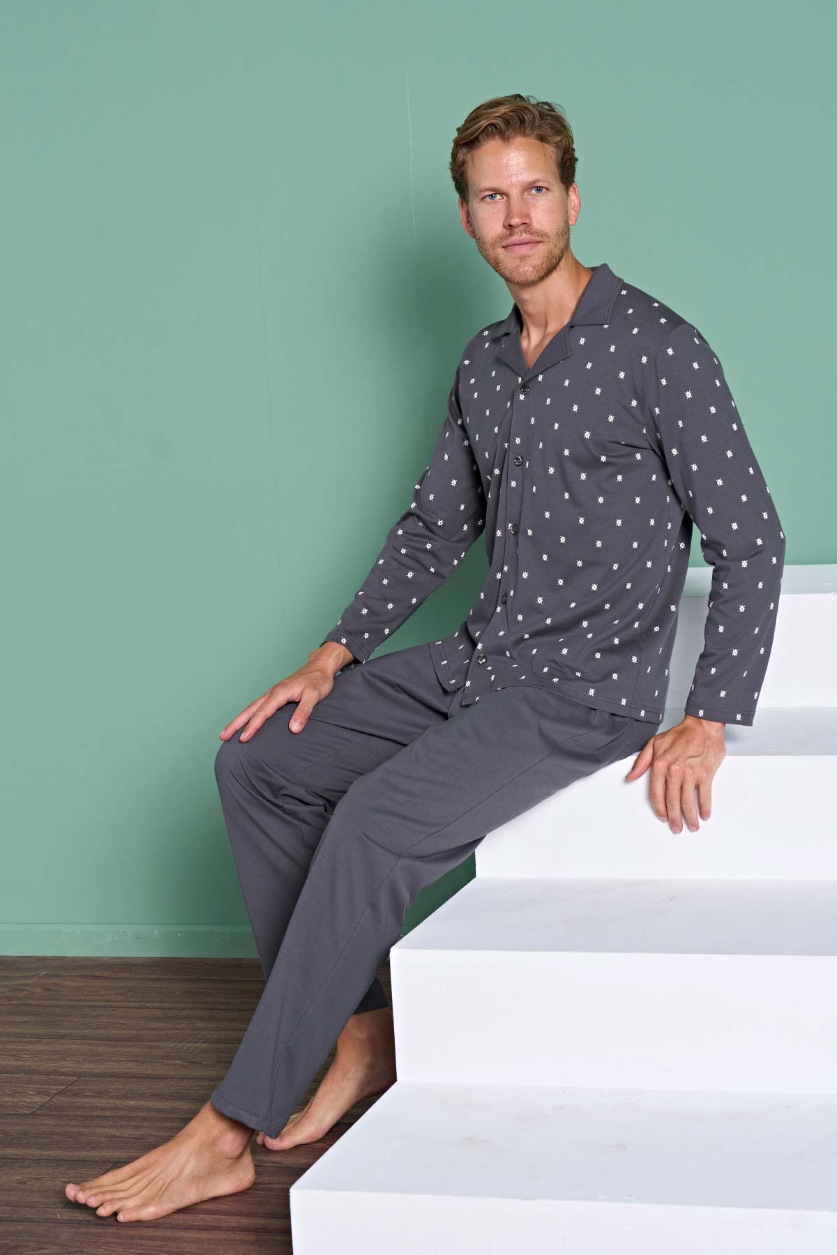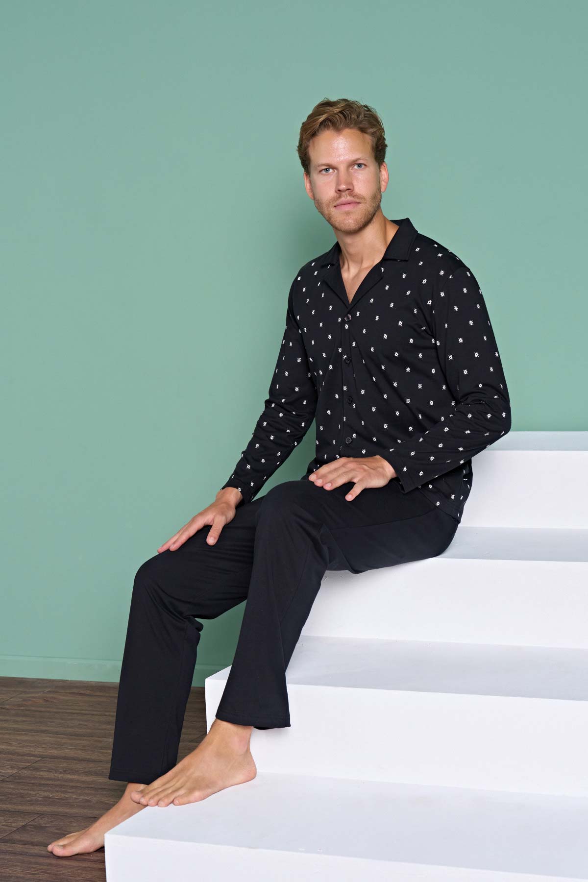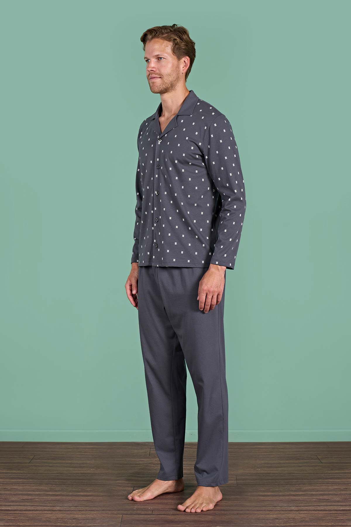 Pınarca Erkek Pijama Takımı Uzun Kollu Gömlek Yaka Büyük Beden Desenli Pamuklu