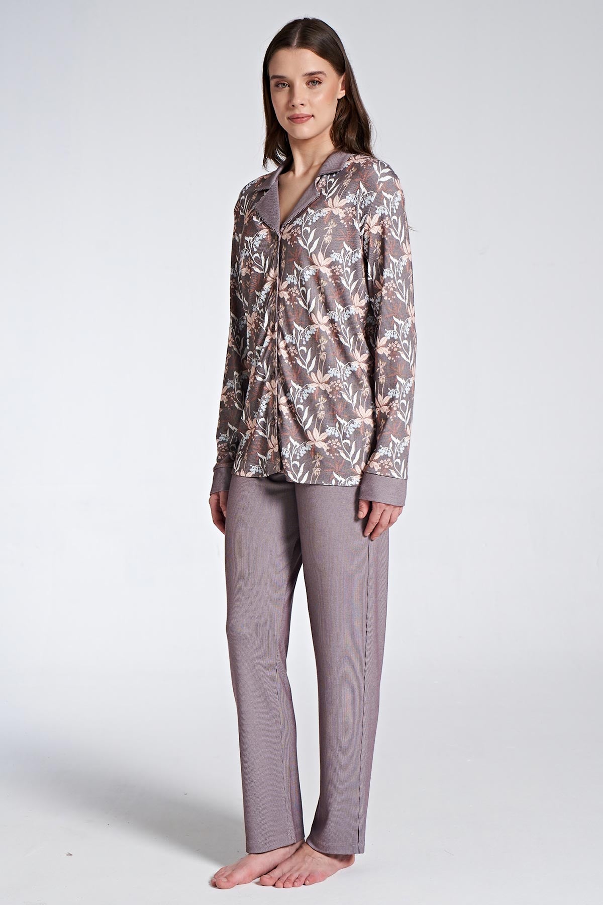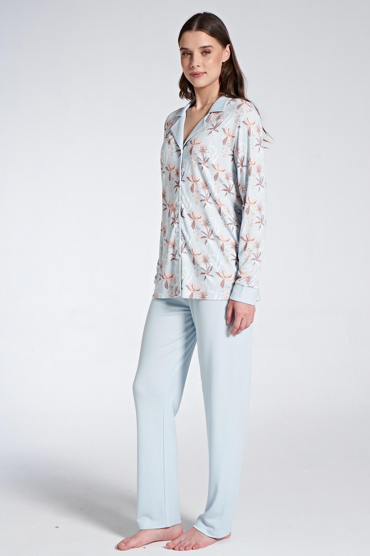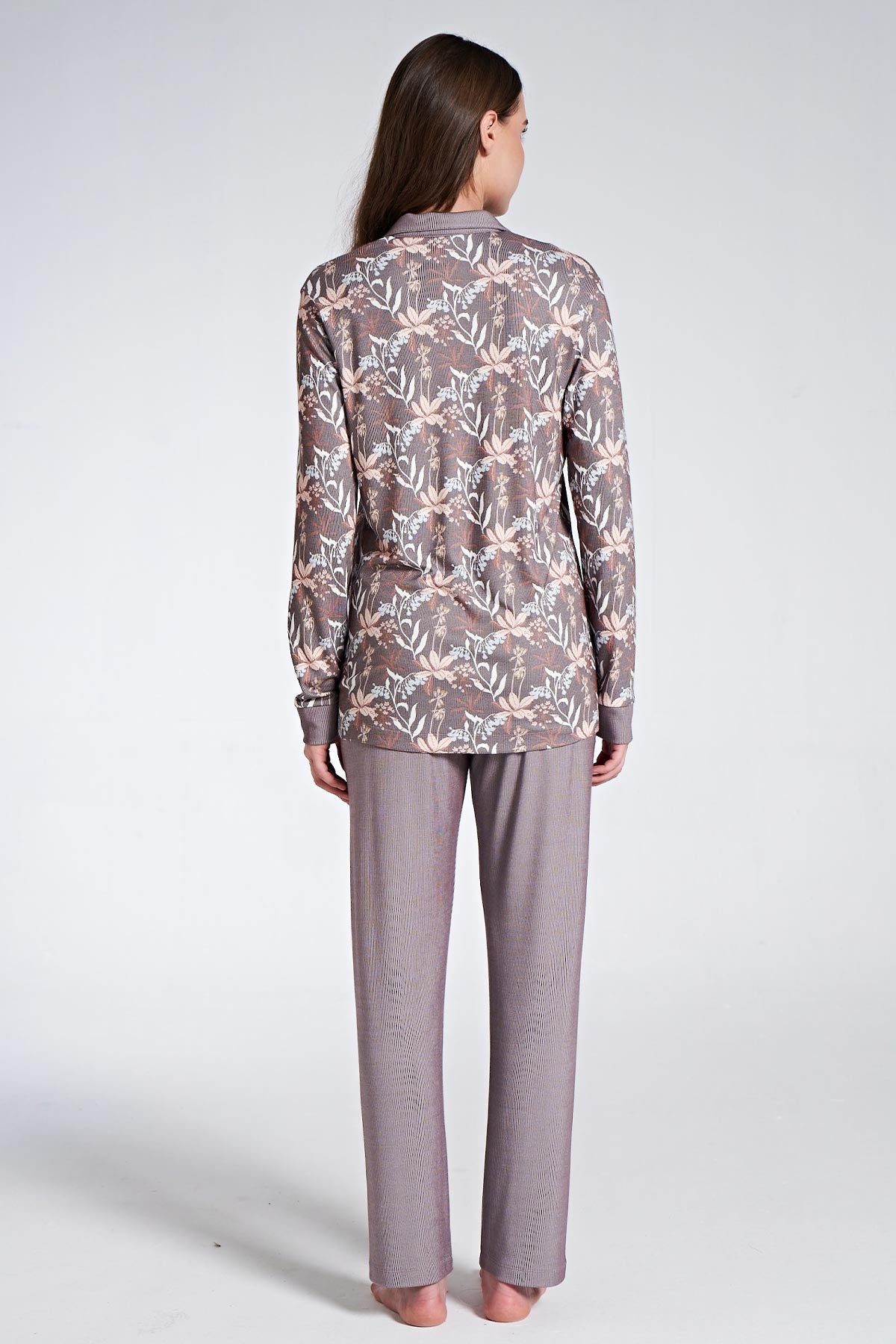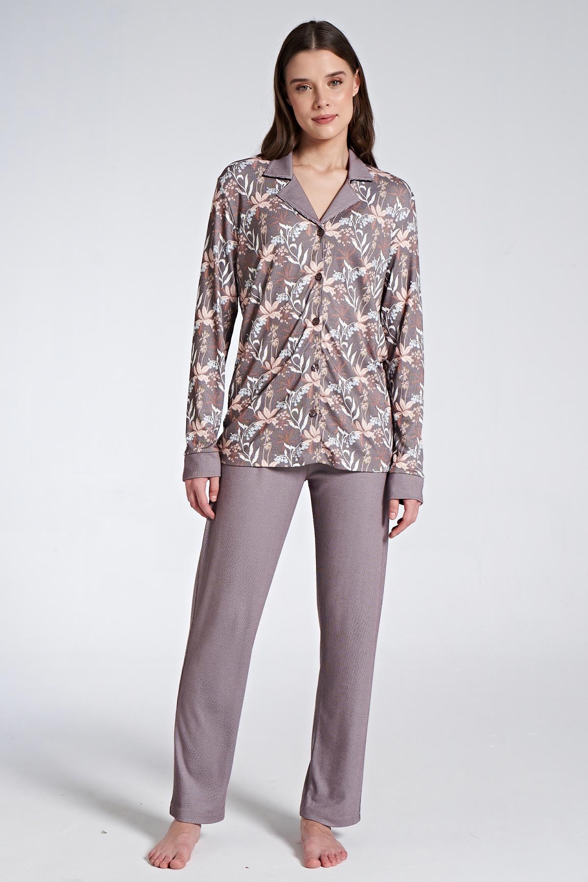 Pınarca Kadın Pijama Takımı Uzun Kollu Gömlek Yaka Çiçek Desenli