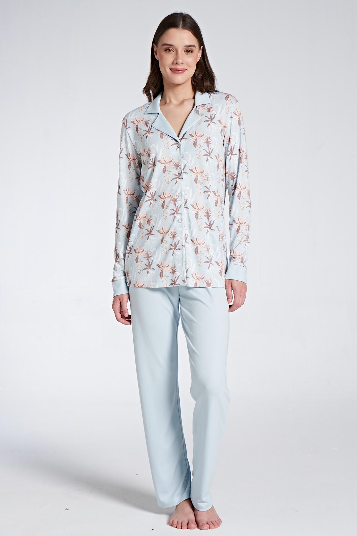 Pınarca Kadın Pijama Takımı Uzun Kollu Gömlek Yaka Çiçekli Büyük Beden