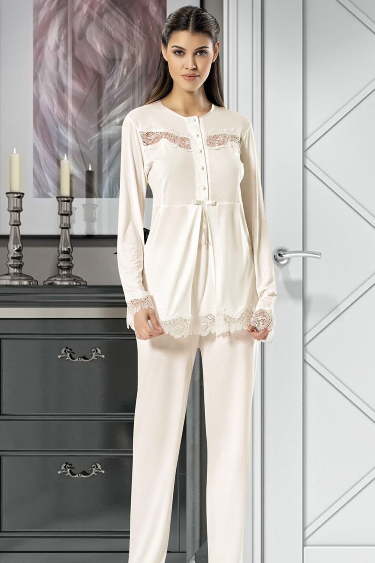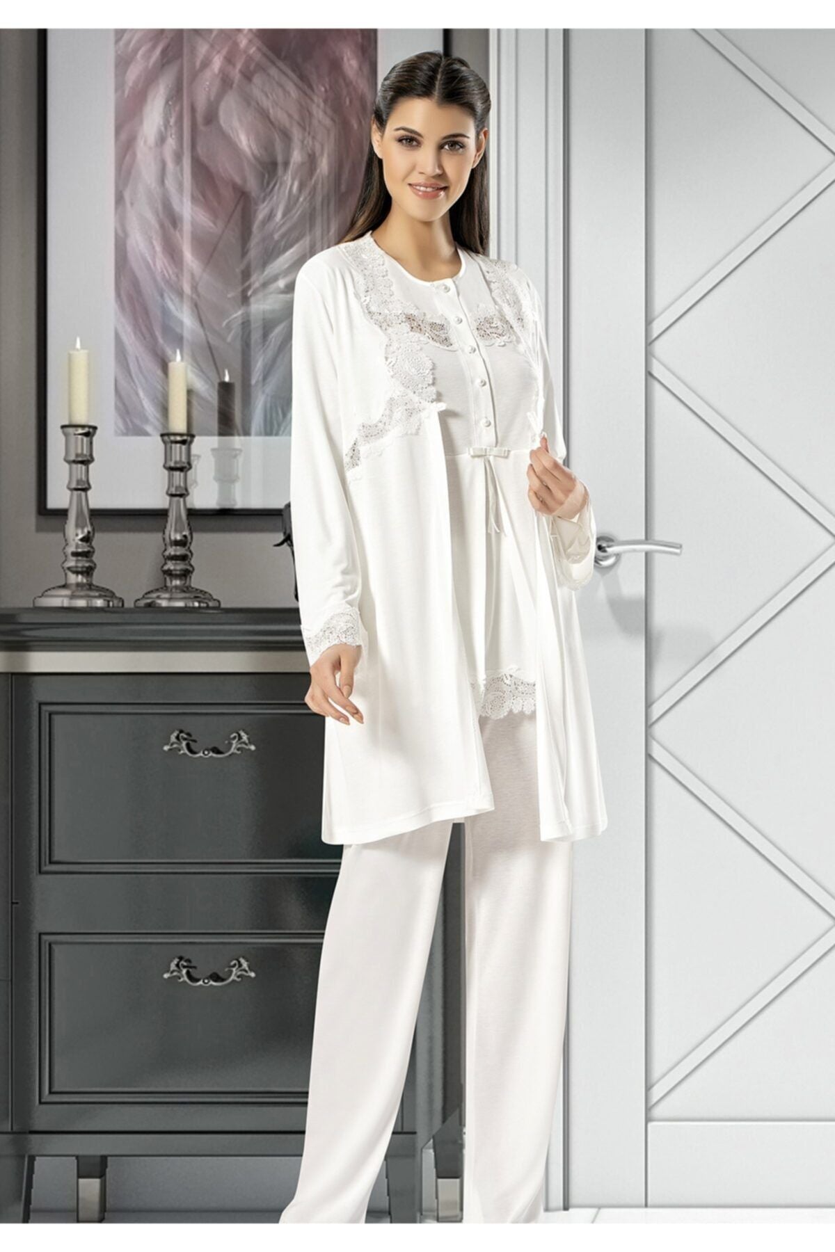 X-Ses Kadın Lohusa 3 lü Pijama Takımı Uzun Kollu Dantelli